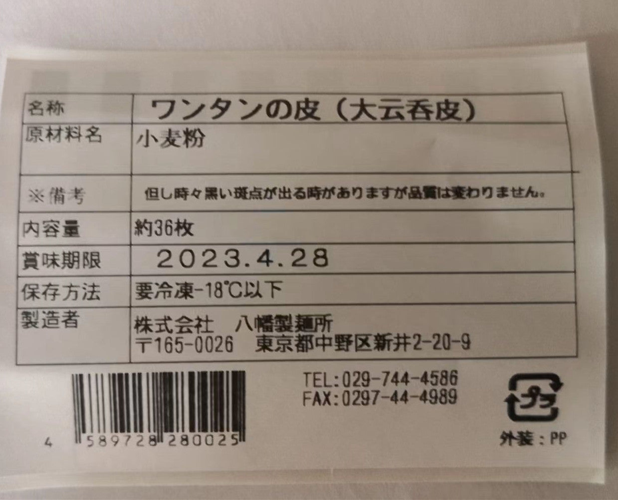 大雲呑皮 (約35枚)450g 10.5*9.5cm 日本国内加工 八幡製麺所 冷凍品